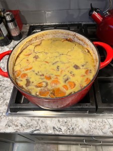 The daube then slowly simmers for hours the second day and then cools down and is refrigerated overnight. As shown in the picture, that allows the fat to rise to the top and congeal so you can remove it the next day.