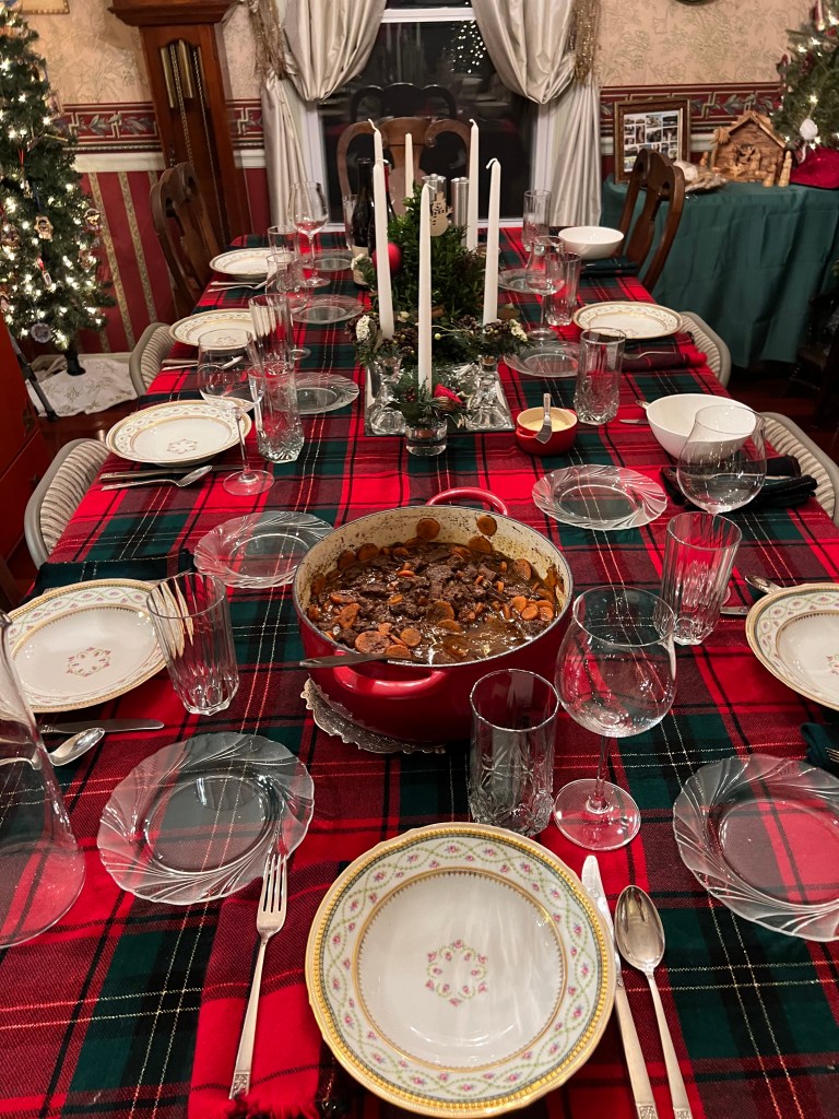 On the third day the final ingredients are added, and the daube simmered for a few more hours before serving. As good as the dish looks sitting on the table, the comments your guests make about the aroma when they walk in the house will make the long effort very worthwhile. Serve over some pasta in a bowl with a slice of crusty artisan bread. I used one of our favorite table wines, the Chateau Segries Cote du Rhone for the marinade. It is only about $12 a bottle but has all the Cote du Rhone flavor and body. I served it with a $35 Chateau Raspail Gigondas and got rave reviews from everyone.