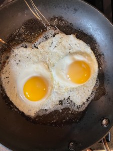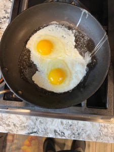 For years I would order my eggs in a restaurant “over VERY easy” and most times them came out OK. Basting the egg in the fry pan with butter or oil works but is a pain and significantly adds to the calorie count of that meal. On Beat Bobby Flay he shared his trick for fried eggs and after using it successfully, I am passing it on here.