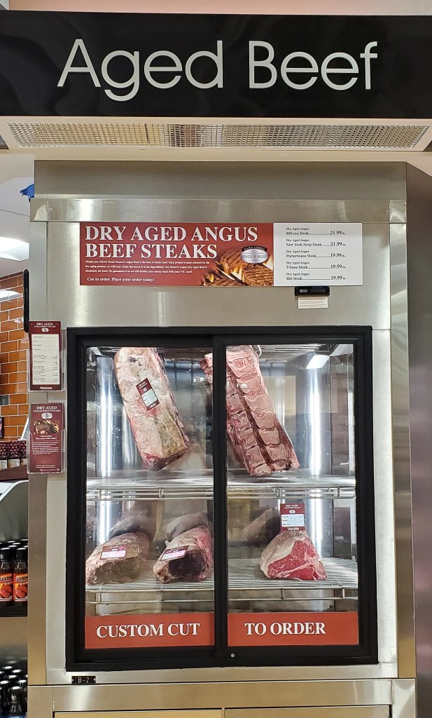 We are fortunate that one of the very large Harris Teeter stores that does Dry Aged Beef in the store is only a 10 minute drive. Not all the Harris Teeter stores have the dry aging apparatus as shown in the picture. The Porterhouse steak is on the right side of the loser shelf. Each cut in the ager has a tag that says when it went in, when it is sufficiently aged that they will cut steaks from if for you, and when it has reached the limit and must come out of dry ager. If they have a Porterhouse that is in the time zone where they are cutting and selling it, you just tell them how big a cut you would like. They will cut it from the large piece being dry aged and wrap it up, and weight it out for you. As I mentioned above, the steak that we get is 1 ½” thick and that gives us a great dinner for two of us and enough leftovers for lunch or a great steak salad for a second dinner. The last one we got was $55 so it carries a very premium price but it is a really great steak for a special occasion.