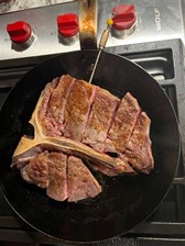 Put the bone back in the hot cast iron pan and reassemble each of the steaks alongside it, crust side up. I then inserted one of the temperature probes I use when grilling into one of the thick slices so I know when to pull it out of the broiler but it needs to be a probe that can handle the heat under the broiler. Top the steak with a few pats of butter. I soften the butter and add some chopped tarragon and sliced garlic and then chill that mixture and slice it into pats so I add some garlic and tarragon flavor to the steak in this way.