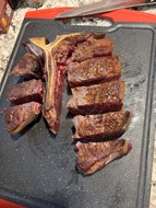 One of the legendary steak houses is Peter Luger’s in Brooklyn, NY. On any list of the top 10 steakhouses in the US, it generally is very close to the top of the list. You can order one steak for however many people are at your table and they will go into their aging room and cut that steak to the thickness needed for that many people. It is served on a platter in thick slices, perfectly cooked. When TV chef Bobby Flay had a chance to go into their kitchen and see them cook the steak, his reaction was they are breaking all the rules but the end result is fantastic. He now only cooks his Porterhouse steaks this way. If you search the web for Bobby Flay Porterhouse Steak Recipe you will find a Bon Appetit article with the recipe I used.