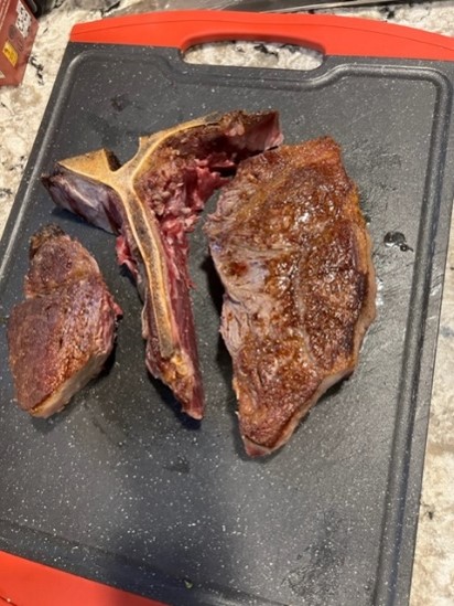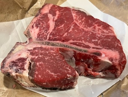 Dry aging beef is a process that breaks down the connective tissue in the cut and the result is a much more tender and flavorful steak. As you can see in the above picture, the steak is a deeper ruby red from the dry aging. While the Porterhouse is a great steak, it moves into a whole new class when it is dry aged. The strip steak portion becomes very tender and easy to cut. The tenderloin is the most tender cut of beef but with not much flavor. For that side of the Porterhouse, the dry aging process really adds flavor to the tenderloin steak. You can do dry aging at home but it is not easy and the best results come from at least two weeks of dry aging which is hard to do in a home kitchen. A dry aged steak that has aged for at least two weeks or longer carries a very premium price per pound. There are companies that will ship you dry agreed steaks, some of them are able to do it where the steak is never frozen which is important when you want a taste that is fully worth the price you are paying for a nice dry aged Porterhouse steak.