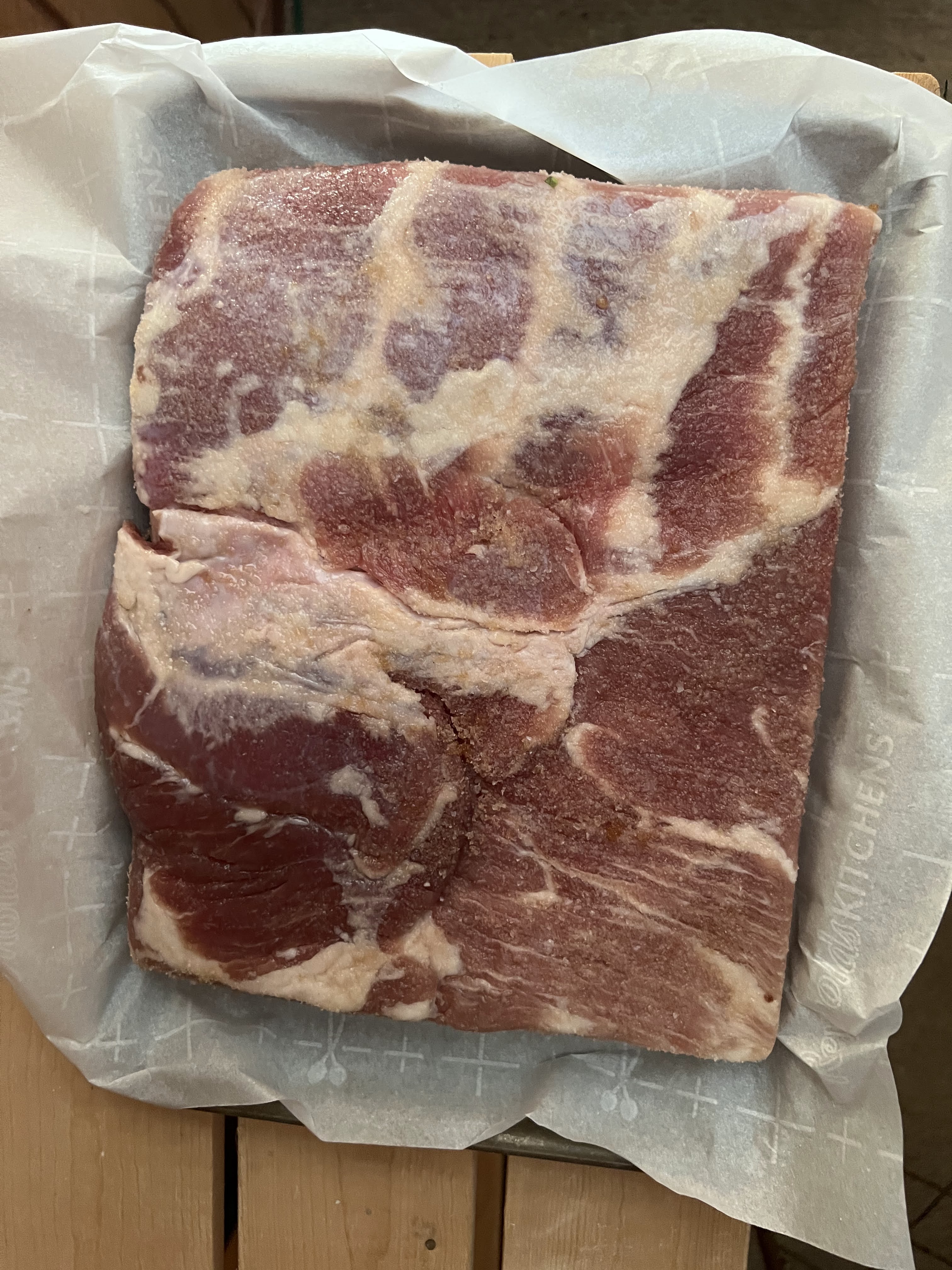 - Mix the kosher salt, pink curing salt, and brown sugar together in a bowl. Thoroughly coat the pork belly with this mixture, making sure to use it all. Put the pork belly on a sheet of parchment in a rimmed baking sheet. A ¼ sheet pan should be a good fit for this size pork belly. Put another parchment sheet on top of the belly and cover it with another baking sheet. Weigh it down with a few heavy cans or something else heavy. I used a brick. Put it in the refrigerator for at least 7 days. Flip the pork belly once each day.
