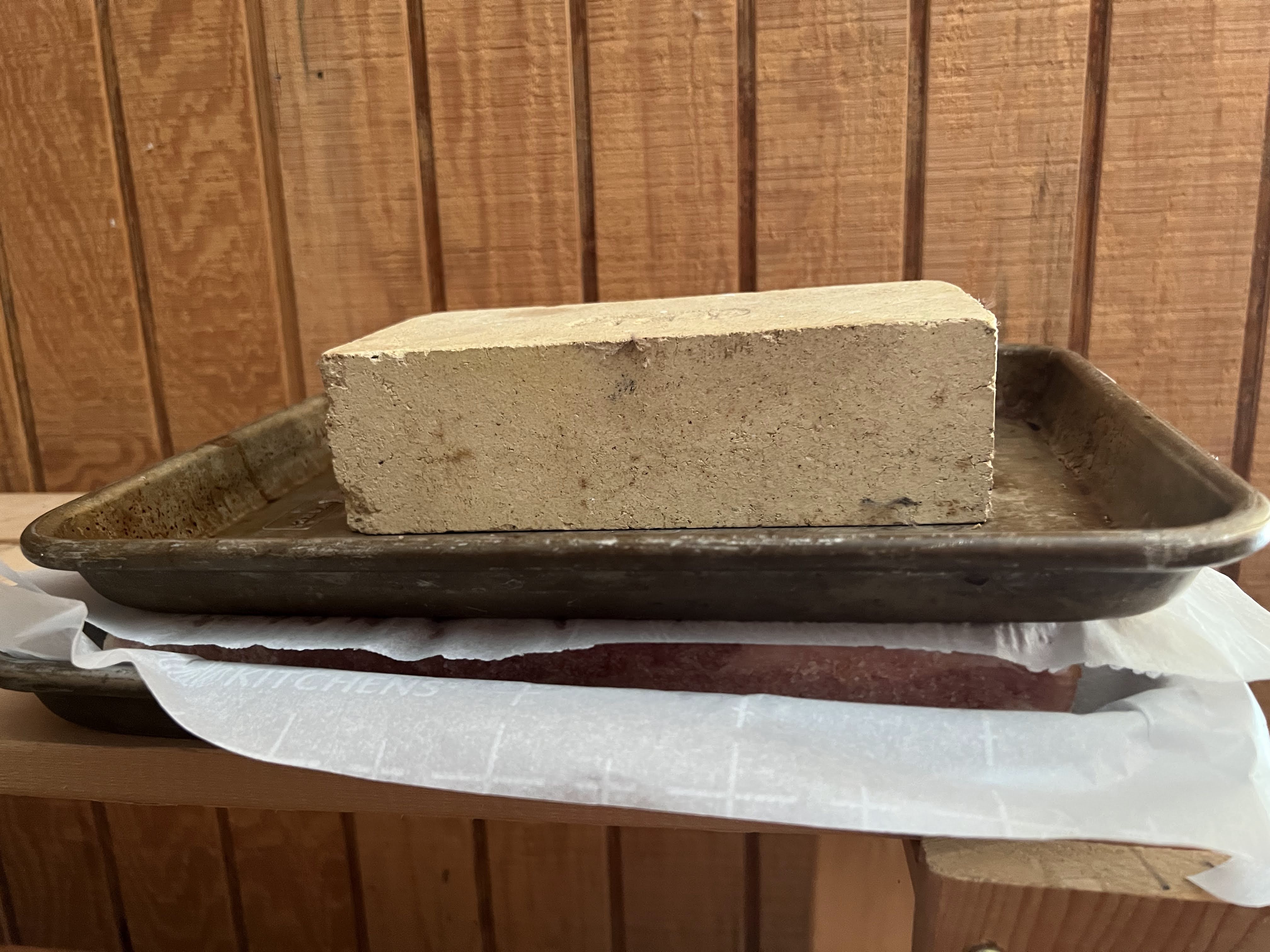 The first step was to cure the pork belly with kosher salt, dark brown sugar, and pink curing salt. We did not have the pink curing salt and there is no substitute for it so we went on line and bought the smallest size we could. It will last us years even if we make bacon several times a year, but it was not expensive and we now have it on the shelf. I rubbed the pork with the mixture and the first picture is that piece of the pork belly with the rub on it. I set it on a sheet of parchment in a ¼ sheet pan and then I covered it with another sheet of parchment paper and then a second ¼ sheet pan and then put a brick in that pan to weigh it down. The second picture shows it ready to go into the refrigerator for 7 days to cure.