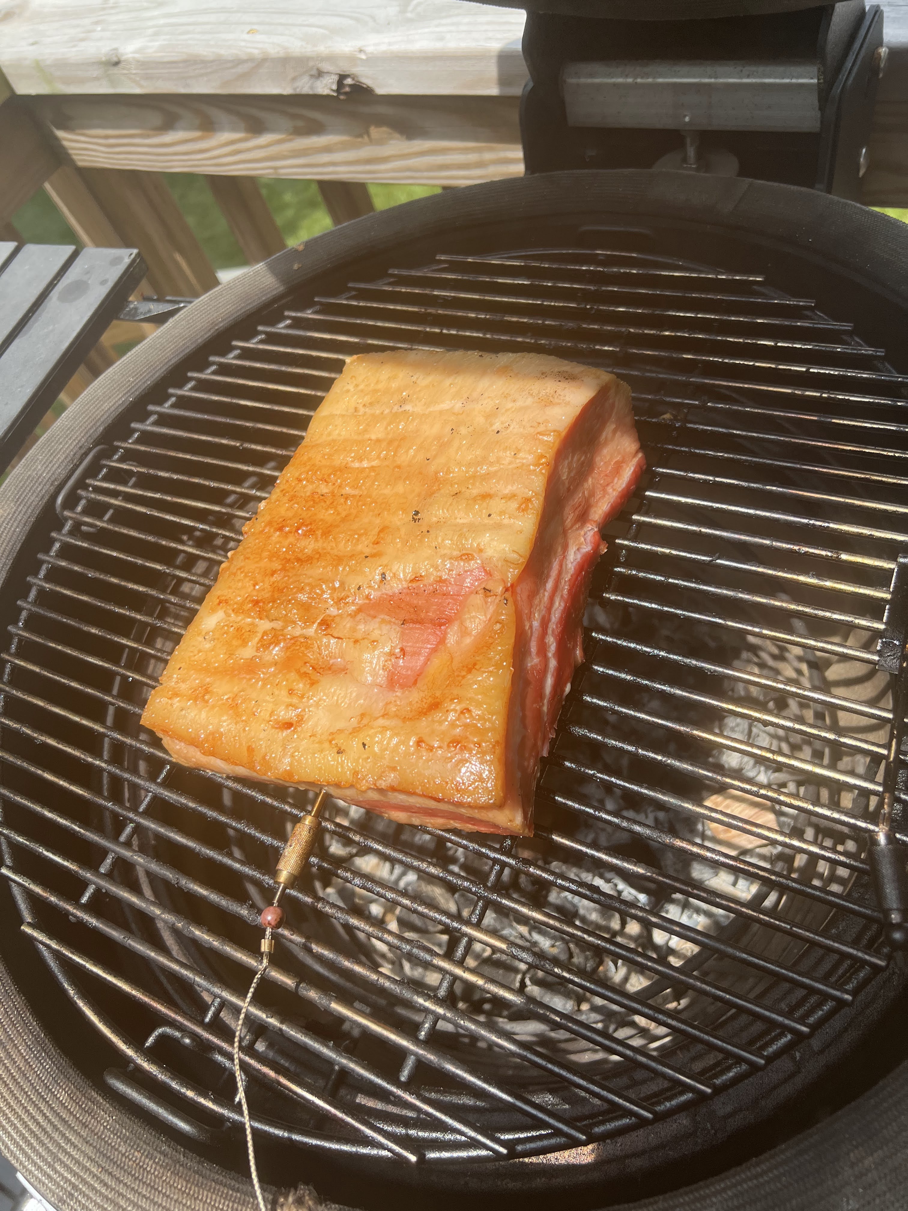 After it cured for a week, I rinsed it off and thoroughly dried it and let it sit overnight on a rack in the refrigerator to thoroughly dry out. I then smoked it for 3 hours on the Kamado with some apple wood chunks until it got to 160° internal. The picture shows it coming off the Kamado.