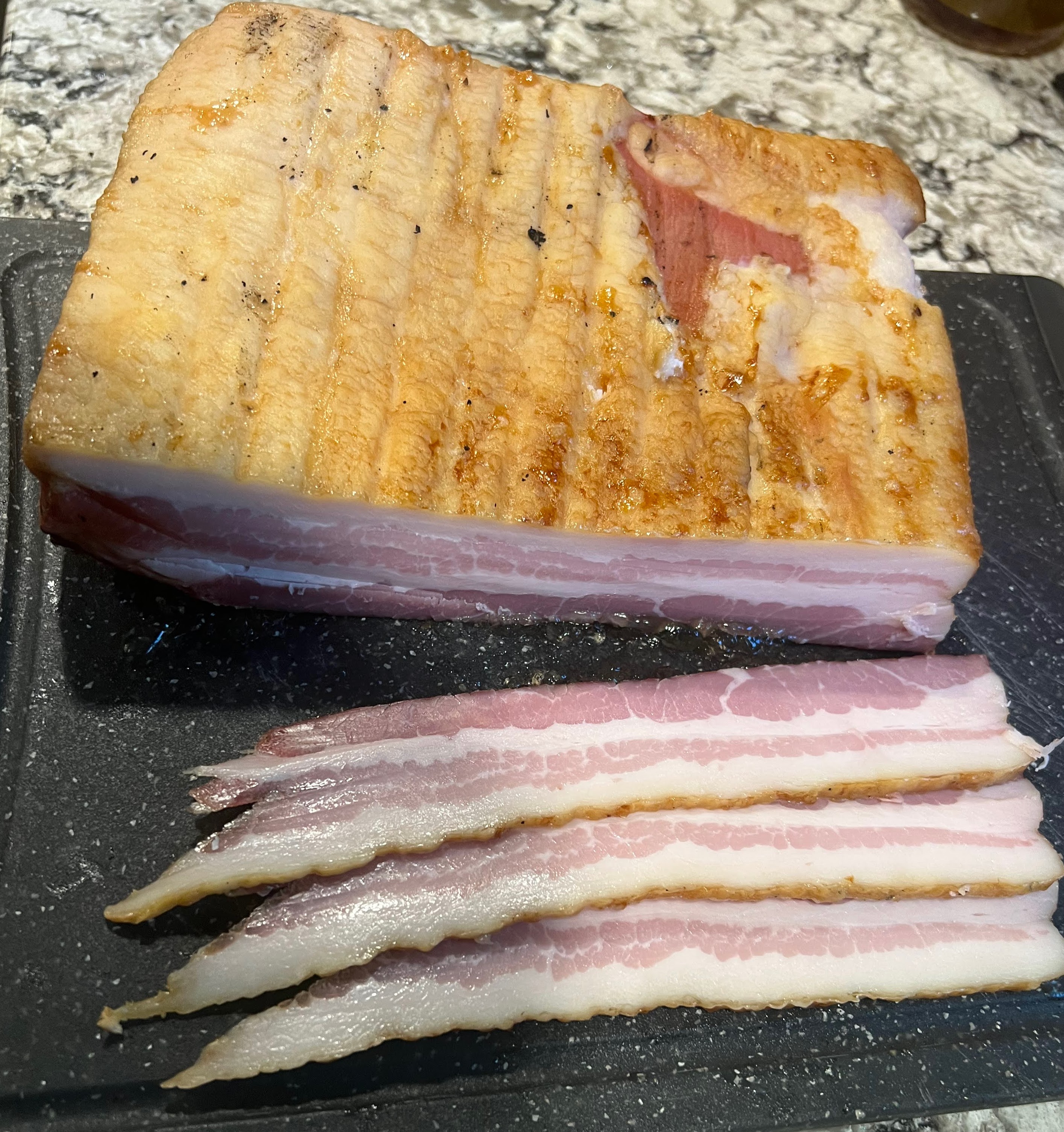 Yes, it was 9 days from when I rubbed the cure onto the bacon until I put some in my mouth. But the first 8 days took less than an hour of total work time. The most difficult thing was making space in the refrigerator for the two pans with the brick on top for a week. Yesterday I had to pay attention to the smoking process but I had my temperature probe giving me the cooking temp on the grill night next to the bacon and the other probe giving me the internal temp. I had them showing on my phone so I spent a few hours reading a good book on my screened in porch, checking my phone for the temps every 5 minutes or so. I will also take credit for some exercise getting up and down to adjust the vents on the grill as needed to keep the cooking temp close to 200°.