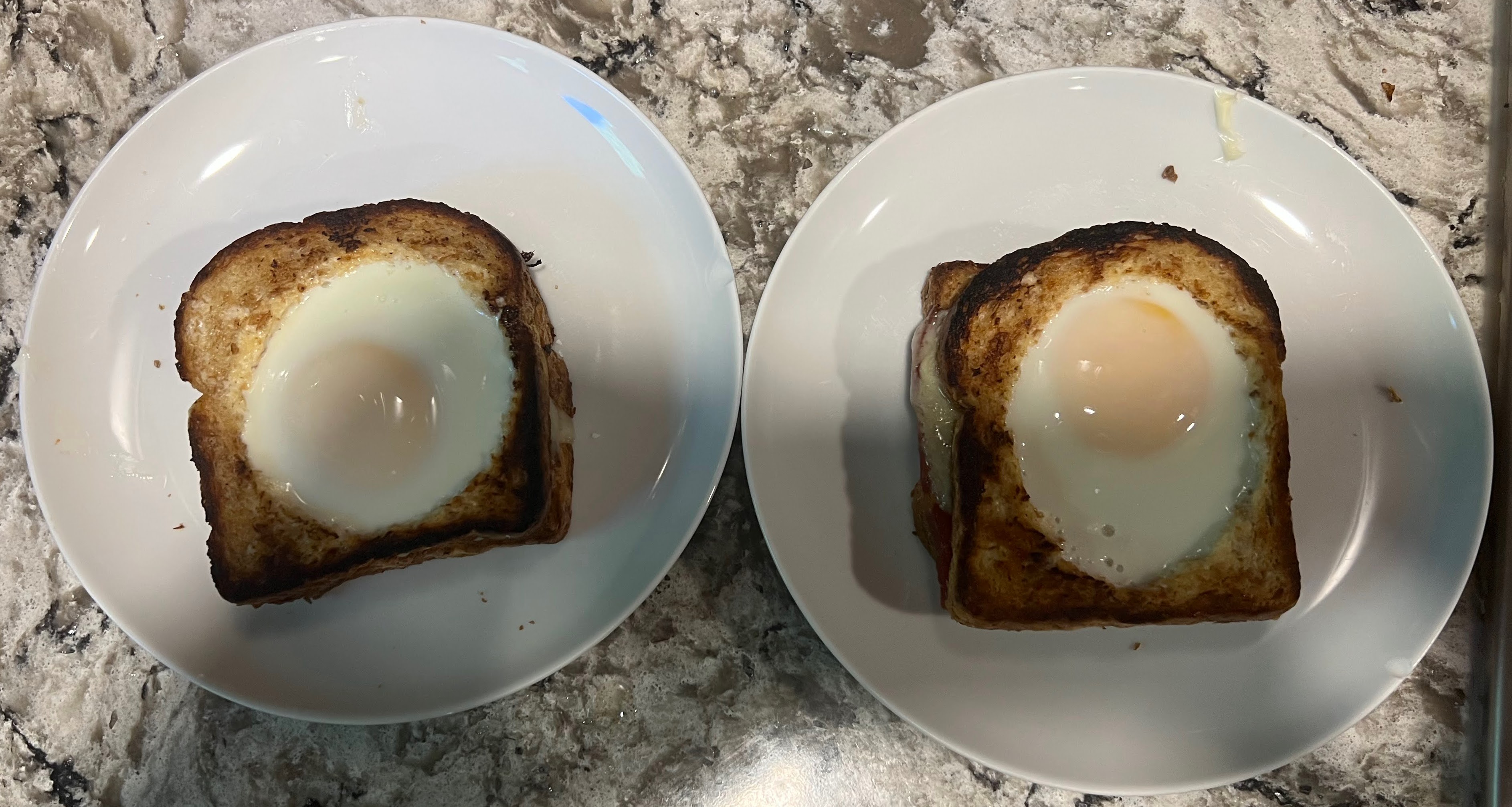 To celebrate I made Toad In A Hole sandwiches for Beth and I for breakfast with the bacon, Swiss Cheese, and an egg. I cut out a hole in one slice of the bread and covered one side of each slice with mayonnaise. I then put the full slice in my cast iron fry pan with the mayonnaise side down to toast it with the cooked bacon and Swiss Cheese on the top side. I then slid it under the broiler for 20 seconds to get the cheese fully melted. I then toasted the slice with the hole in it in my fry pan mayonnaise side down and then flipped it so the toasted side was up. I cracked an egg into the hole in each slice and let it cook until the white as mostly cooked. As discussed in my earlier post of cooking fried eggs, if you let the egg cook in the fry pan until it white is fully cooked, the yolk will no longer be runny, so I built the sandwich in the pan with the bottom slice, bacon and cheese and then used the spatula to put the slice with egg inside on top of that. I then put the pan under the broiler for about 30 seconds until the white was fully cooked but that still left the yolk runny. The picture does not show the bacon since it is at the bottom of the sandwich, but it was delicious.