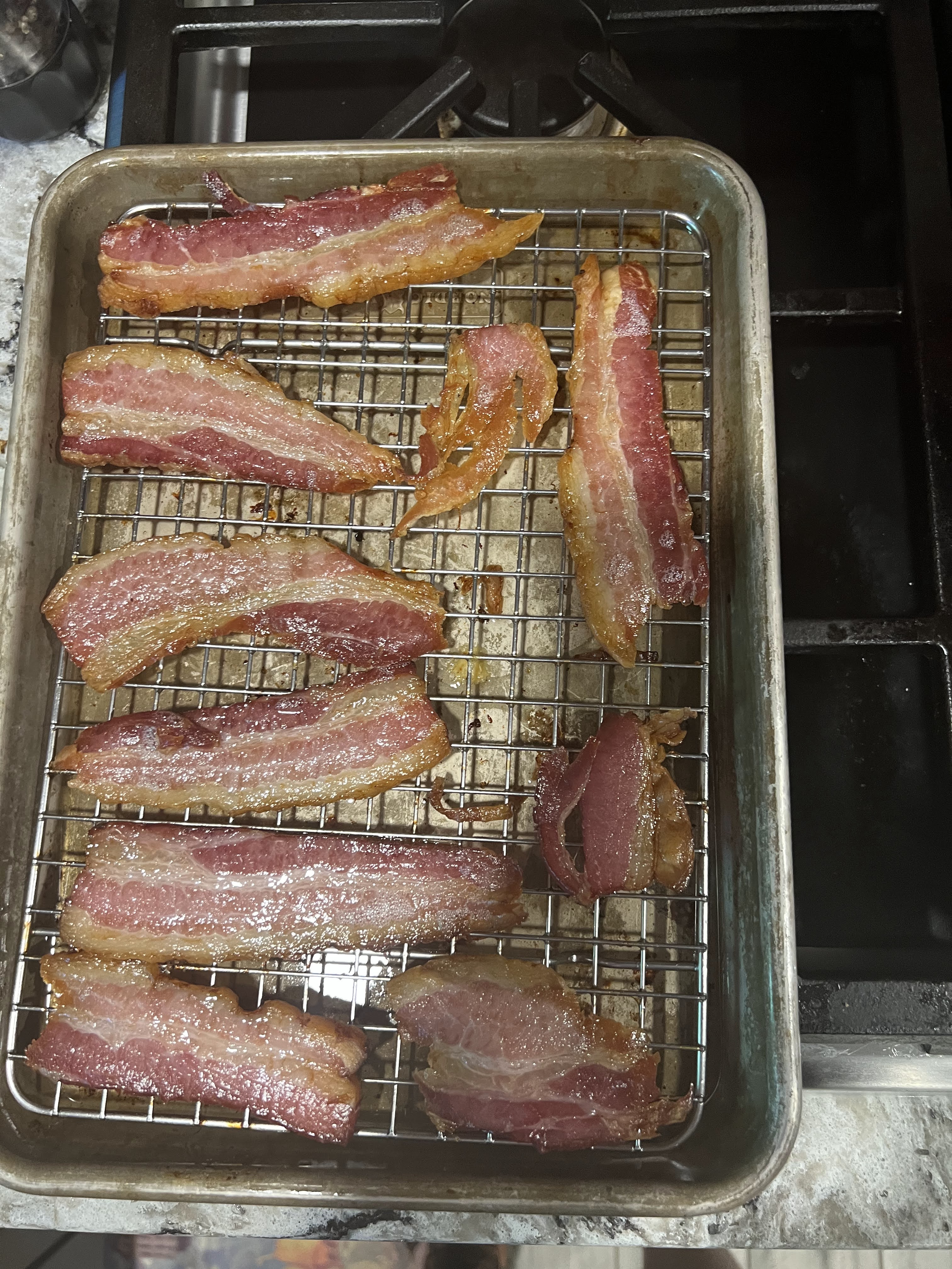 I then sliced and cooked a pound of the bacon for Beth who is making a delicious quiche today that we can have for breakfast and/or lunch tomorrow. The recommended approach to cook the bacon is on a rack in the oven at 350 degrees for about 30 minutes. Because these were thick slices and we wanted them crispy for the quiche, I went to 36 minutes.