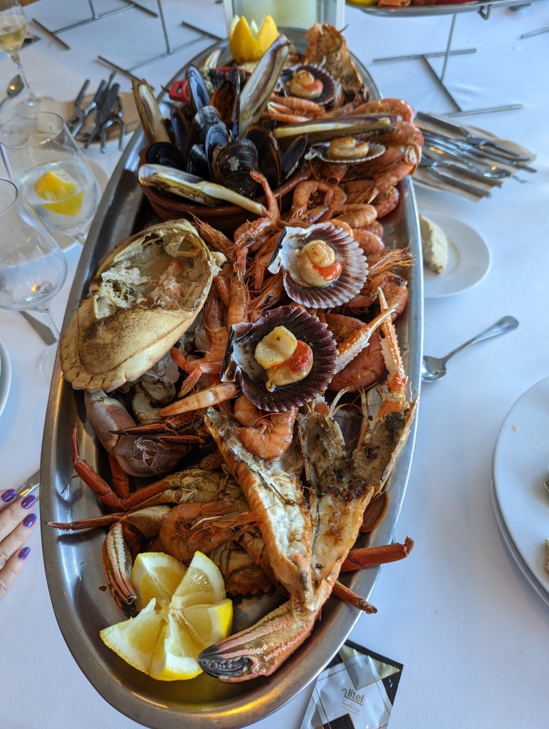 The afternoon of that first day was supposed to be our first vineyard tour at Pazo de Villarei in Rias Baixas, a producer of great Albariño. A week before the trip started Howard got a call from the vineyard that they had experienced a severe drought and had a very early limited harvest and could not accommodate our group this year. Howard was able to quickly arrange a wonderful luncheon for us in the town of Vigo which sits on a bay just off the ocean, at the Calle de las Ostras restaurant. We started with a freshly shucked oyster for each of us that was briny and delicious. Then the platter of food shown in the picture showed up and there was one of these platter for every two people! It included: Strong Crab, 2 blue crabs like we get in the Chesapeake, scallops, langoustine, at least a dozen shrimp, mussels, razon clams, a fish filet (sorry, I forget what fish it was), and a bowl with long thin black shells. Those were barnacles where you broke open the shell and sucked out the strip of barnacle. I tried one and can check off barnacle as tried it and don’t need to do it again. Beth declined to try one. There was a very nice bottle of white wine on each table of 6 people and when it got low, another one appeared. Our table enjoyed three bottles of the Beiramino from Ribeiro which is made from two grapes we were not familiar with. Palomino and Treixadura. It was a lovely crip white wine but I do not believe it is exported to the US. The price for this meal, wine, tax and tip included, was only €30! I think it would 3X that to get anything close to the quantity and quality of very fresh seafood that we had. I would not expect that the big platter of food for two people is on their standard menu if you walk into the restaurant. I believe it is something that Howard put together with the restaurant owner as a package deal. One of the people on our trip could not eat gluten and I was impressed by every restaurant we went to, and all the vineyards that had food for us while we tasted, being very solicitous in making accommodations for her.