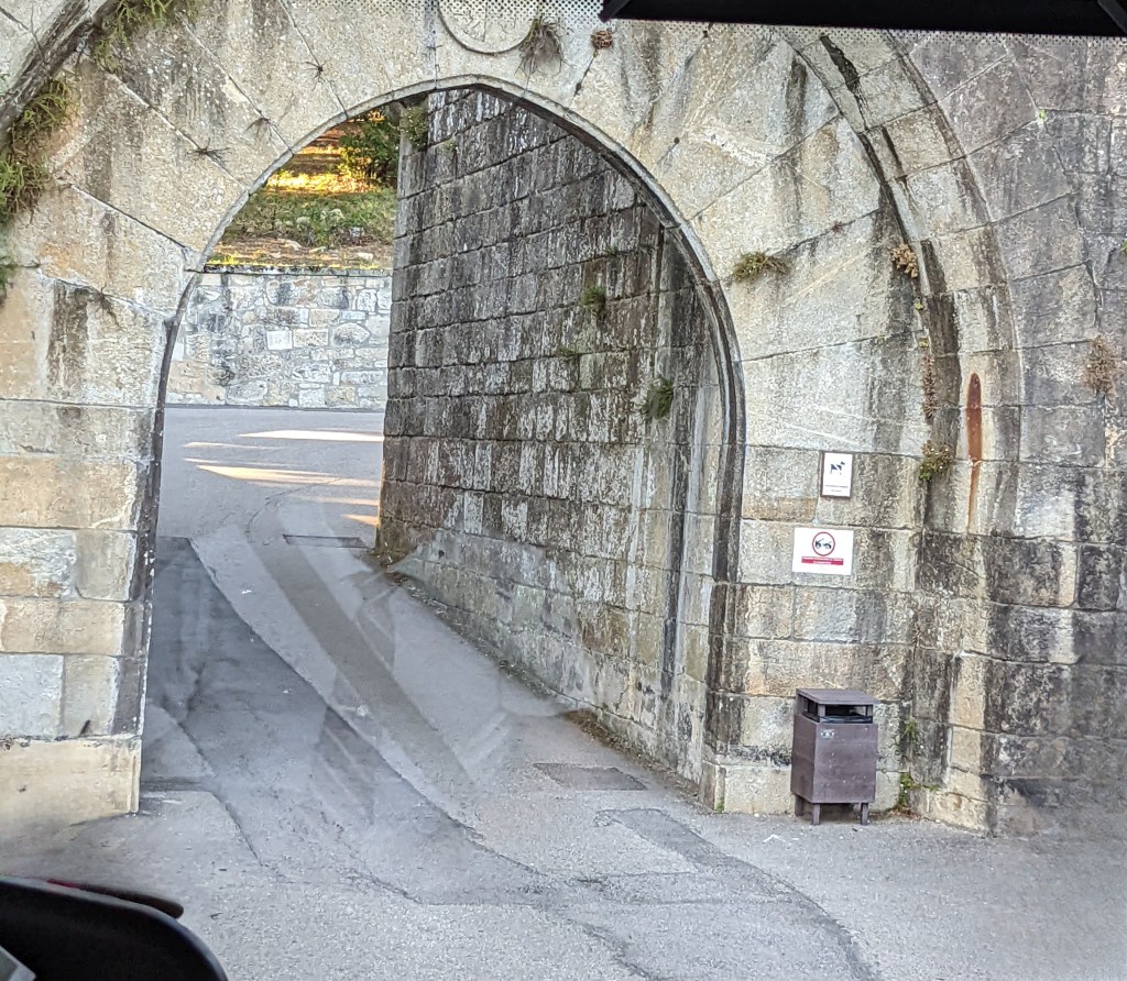 After that wonderful luncheon we were driven to the lovely old Parador Baiona which is situated on its own peninsula just outside of town. We really loved this hotel and the vistas from the grounds were fantastic as you can see in the picture. Because this Parador was originally a medieval fortress, it is surrounded by walls and this picture is the gate that the bus has to go through to get into and out of the hotel. The first time Howard brought a group to this hotel the bus could not get through this gate and everyone had to walk up the long driveway to the hotel and a cart took multiple trips to get all the bags up to the hotel. The Parador excavated the ground to lower the roadway so busses can now get through and up to the hotel. But we learned just how great a driver Ramon is when we left the next morning and watched all the back and forth turns he had to make to align the bus to get out of that gate.