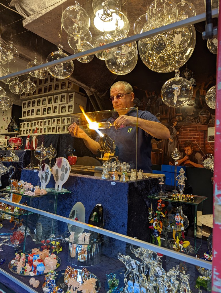 Understanding that people go to the markets to party, not to shop, let us establish our plan for each market we visited. We would have one or two snacks and something to drink (and I will talk about food and drink next). We would then walk the booths to see what was for sale. Most of the booths with products had exactly the same things made in factories in low labor cost countries, not in cottages outside that town. But we generally found a few that had local products of interest. Two of the markets had people blowing glass ornaments in the booth which we liked, and Viking brought a glass blower on board for an evening show which significantly impacted my wallet. We generally found something we liked at each of the markets either for us or as a present for the family. But most of the time was spent eating, drinking, walking, and observing the crowd at the market, usually all four of these things at the same time.