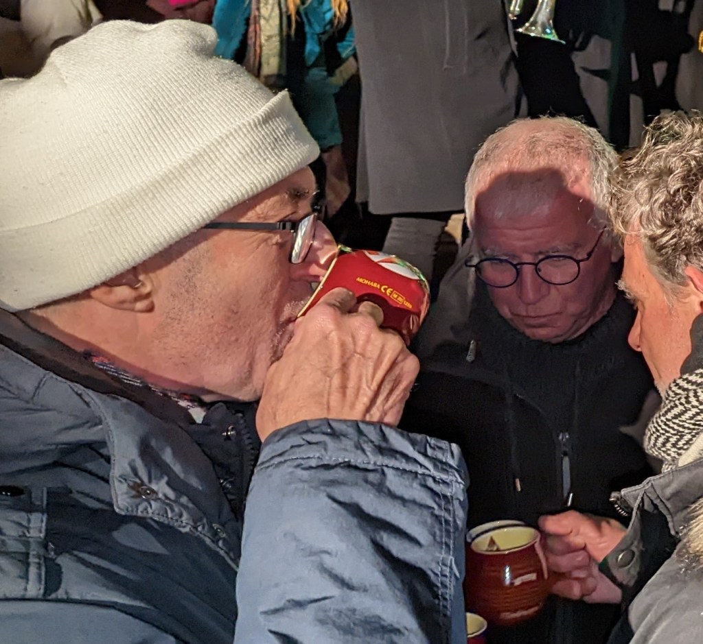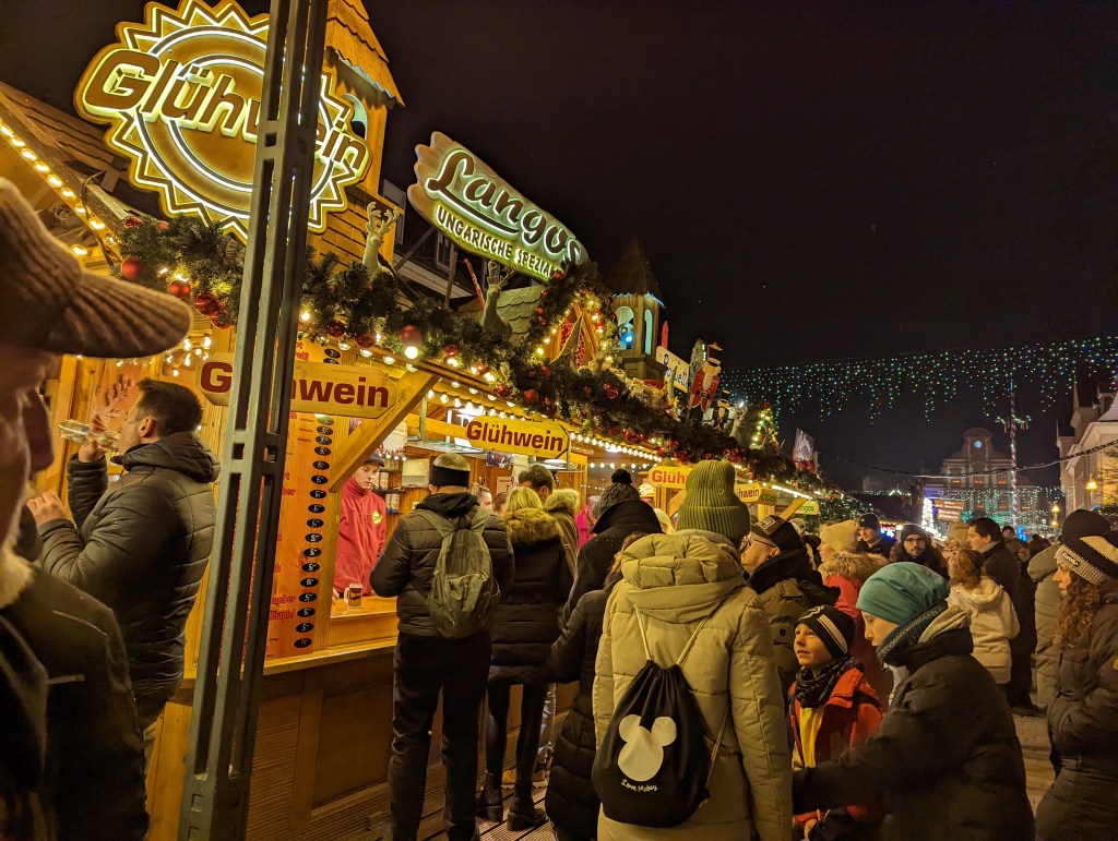 Very few of the food and drink booths took credit cards, Euros only. Some of the merchants did take credit cards, especially for the more expensive things like the blown glass ornaments. The primary beverage was Gluhwein – hot mulled wine. Every fourth booth was generally selling gluhwein. They had both red and white, but we only had the red. I could not taste any difference in the gluhwein from any of the 10 different markets we had it at, and in at least one of them we had it from two different booths. The recipe appears to be pretty standard. The best thing about Gluhwein is not the taste, it is that it is a hot beverage. The temperature ranged from the low 30s down to 19 degrees Fahrenheit and it was a damp cold from being on the river and often some wind blowing down the streets. Holding something hot in your hands was very pleasant and the warmth felt good running down your throat. It was sold in small glass mugs for 5-6€. If you returned the mug to the booth you got a deposit of 2-3€ back. I was very happy that Beth chose to only bring two mugs home. One of our friends that we met on the cruise pointed out to us that some of the gluhwein booths had the option to add a shot of rum, tequila, aquavit, or other liquors to the gluhwein for another 2€. We found that rum significantly improved the taste and did that several times. I did get an OK hot chocolate at one booth we were visiting in the daytime. Not thick enough to stand a spoon in but several orders of magnitude better than Nestle’s Quick. There were some booths selling beer and small bottles of wine, but gluhwein was the dominant beverage at every one of the Christmas Markets.
