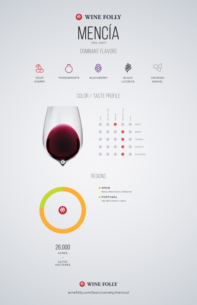 This excellent graphic on Mencía comes from Wine Folly. The wine has a very pleasant flowery aromas with red fruit notes like raspberry, strawberry, cherry, and pomegranate. While medium bodied, it has a deep red maroon color with fresh acidity and chalky tannins that you can taste but they are not at all dominant. The taste is the red fruits that were in the aroma with some secondary notes of black peppercorns, violets, and some gravel minerality.
