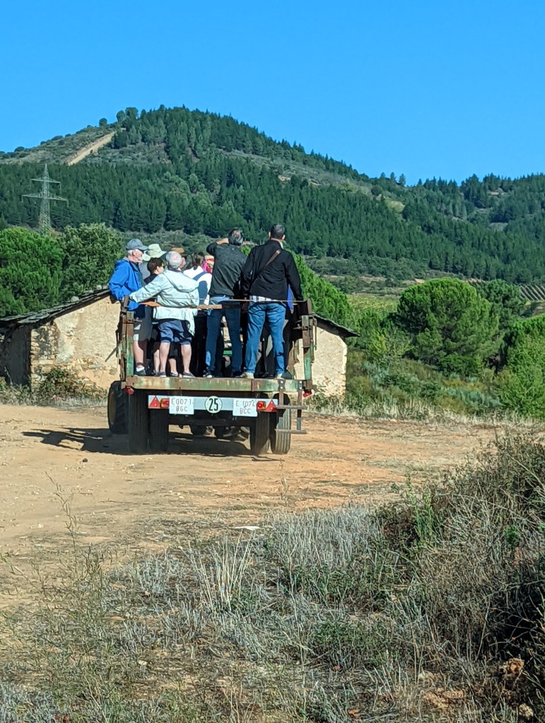 We were introduced to Mencía in a visit to Cesar de Burbia in Bierzo and I have a number of pictures from that visit. From our comfy bus we climbed onto a large flatbed truck and held on the ropes surrounding the truck bed as we drove up into the higher elevation hills to the vineyard where we tasted ripe grapes from the vines and listened to the wine maker talk about limiting the yields and being all organic in his approach.