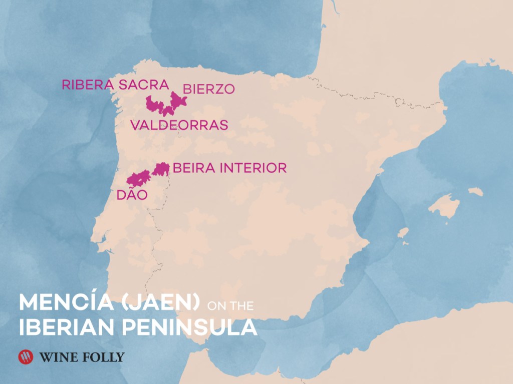 According to Wine Folly’s excellent web site, Mencía (“Men-thee-ah”) is a medium-bodied red wine grape that produces high quality wines with floral and red fruit flavors. If you’ve never heard of it, it’s not surprising, Mencía only grows in Spain and Portugal on the Iberian peninsula. What makes Mencía special is it has shown the ability to age like other fine wines and it offers rich aromas in the glass. If you love Pinot Noir and other aromatic reds (like Gamay or Schiava) then Mencía is something worth investigating. Mencía is labeled as Jaen (“jyne”) in Portugal.