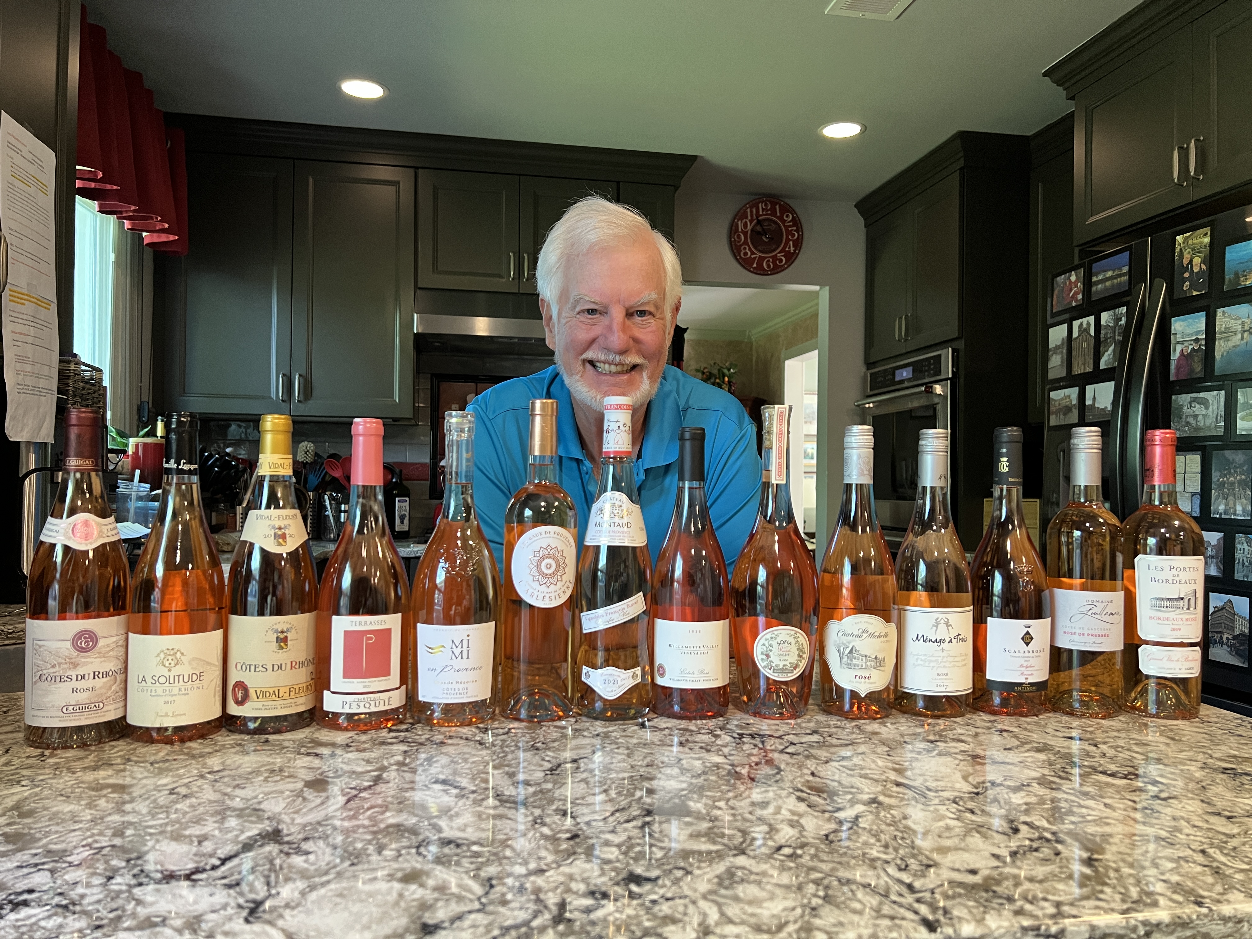 Things are very different today.  The wine makers in the southern Rhone valley, often called Provence, took some of the delicious red wines that they have made for centuries and pulled off some of the juice after just a short period of time in the tank with the skins and made some delicious Rose wines.  When red wine grapes are pressed, the juices are all clear and you can make white wine from red grapes.  Classic French Champagne is about 1/3 juice from Pinot Noir grapes but only the clear juice is used.  Red wines get their color from the juice being left in the tank after pressing or crushing with the skins for weeks or months.  Most of the flavor in the grapes is stored in the skins and this time “on the lees” lets those flavors and color from the skins be pulled into the juice that is fermented and becomes wine.   In this blog I will use rose to refer to color and capitalize it, Rose, when referring to wine.  As you look across the 14 bottles of Rose in this first picture, you will see lots of variation on the rose color.