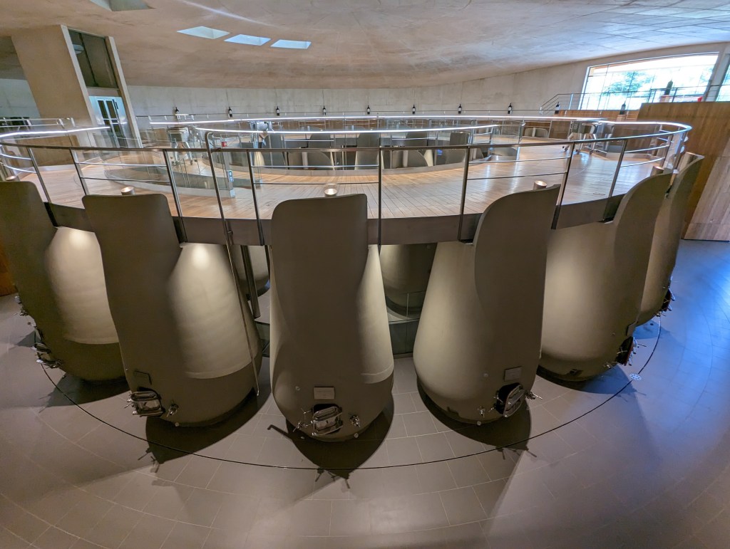 The pictures below are the new cellars of Beychevelle, Haut Bailly, Leoville Barton, and Figeac as other examples.  While all are fully committed to the gravity process and being very energy efficient, they have their own idiosyncrasies such as using concrete or wooden tanks of different sizes so they get the wine that they want to make.  The end result is wine of much higher quality, both their Grand Cru wine and their second wine.  It was a significant investment to put in completely new wine making equipment and many smaller chateaus are not able to afford that change yet and their wine is not getting those benefits.