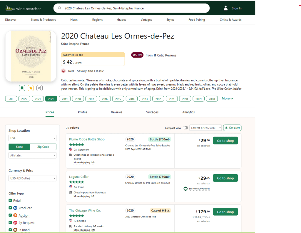 My primary go-to web site is www.wine-searcher.com.  The picture below is a screen shot of their site where I was looking for one of my favorite Bordeaux wines.  I put Ormes-de-Pez in the search box at the top and this is the screen that was returned.  I then went to the pull-down list under Shop Location on the left and chose USA.  For those reading this blog that are in other countries, they have a very wide list of companies that you can select.  If I put in my state, Maryland, I would get back a screen that shows they do not have any Maryland stores that are selling this wine in their records but they do have nine on-line resellers in the US who will ship it to me in Maryland.  I can look at different vintages and see how many retailers have that vintage and at what prices.