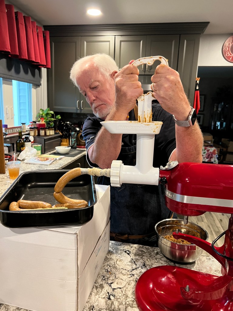 At the end of his write up he shows a total time of 2 ½ hours, not including clean up. I easily spent double that on this first effort. And the clean up was at least 30 minutes each after the grinding and after the stuffing. It would have been much worse if almost all the Kitchen Aid grinder and stuffing accessories had not been able to go in the dishwasher.