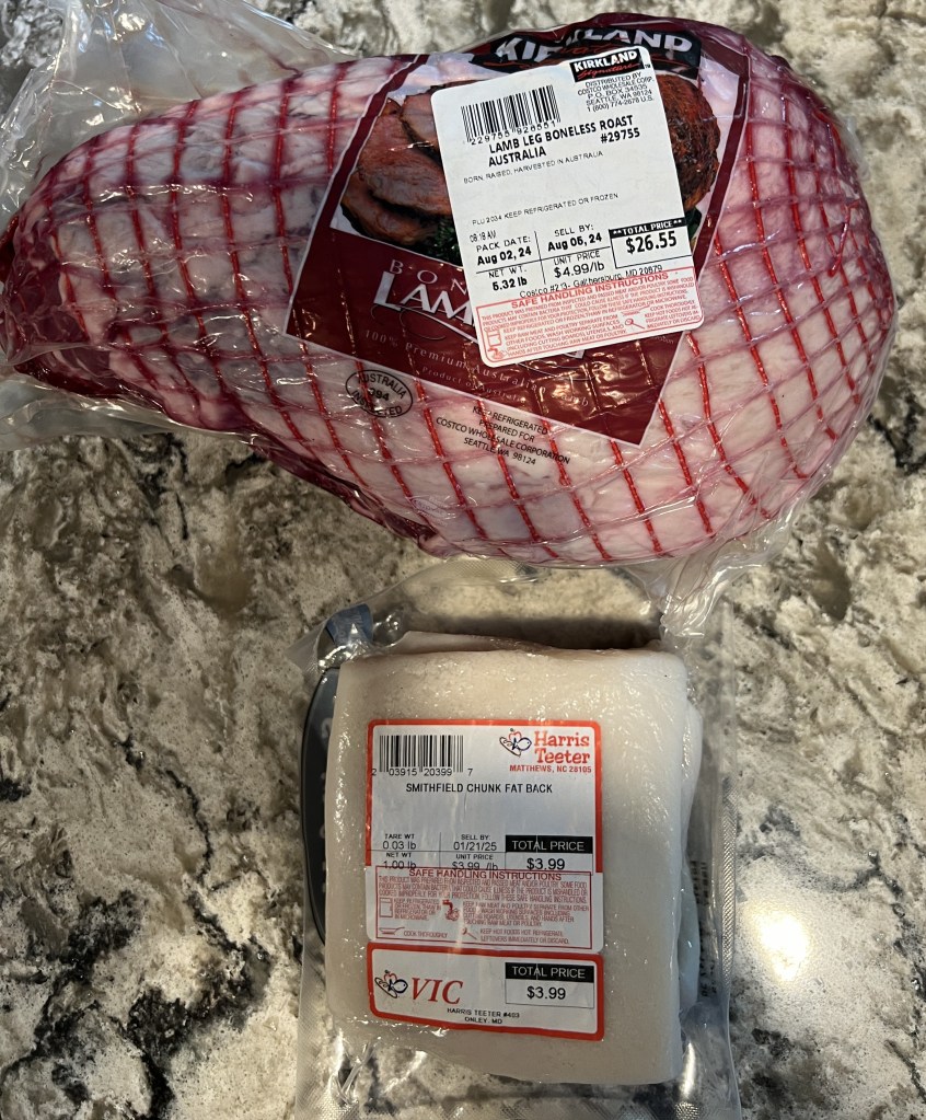 - Harris Teeter showed up in my search as the closest source for fatback pork. I needed to ask someone where it was in the store, but they took me right to it. It was a 1 lb. package with three square pieces of fatback in the package for $4. I needed to trim off the skin but with a sharp boning knife that only took a couple of minutes and I had 10 oz of the fatback after removing the skin. That did not give me the same 3:1 ratio as the recipe calls for but because I had taken the pieces with the most fat off the boneless leg of lamb, I was comfortable with that mix and was very happy with the end product. The packages for the lamb and the port fatback pork that I bought are shown in the picture below.