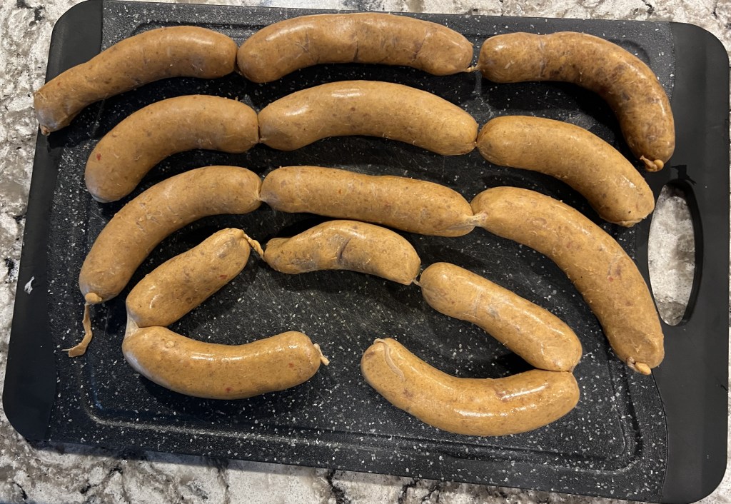 When all the sausages were stuffed I followed Joshua’s suggestion and put them in a bowl covered just with some paper towels overnight in the refrigerator to let the all the flavors blend. We then froze the links in four packages and will be using them in the recipes below over the next two months.