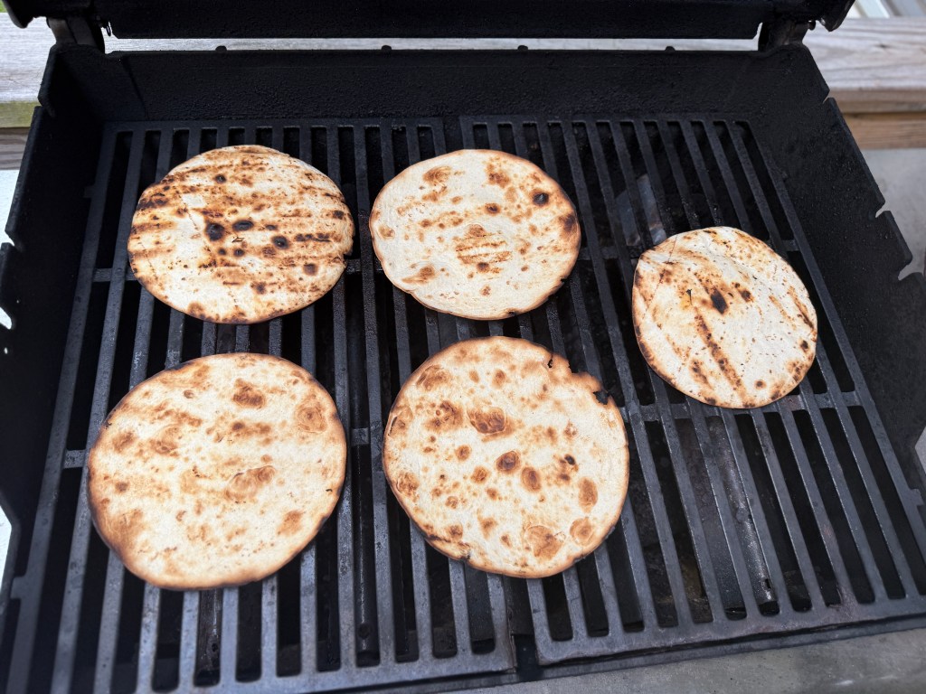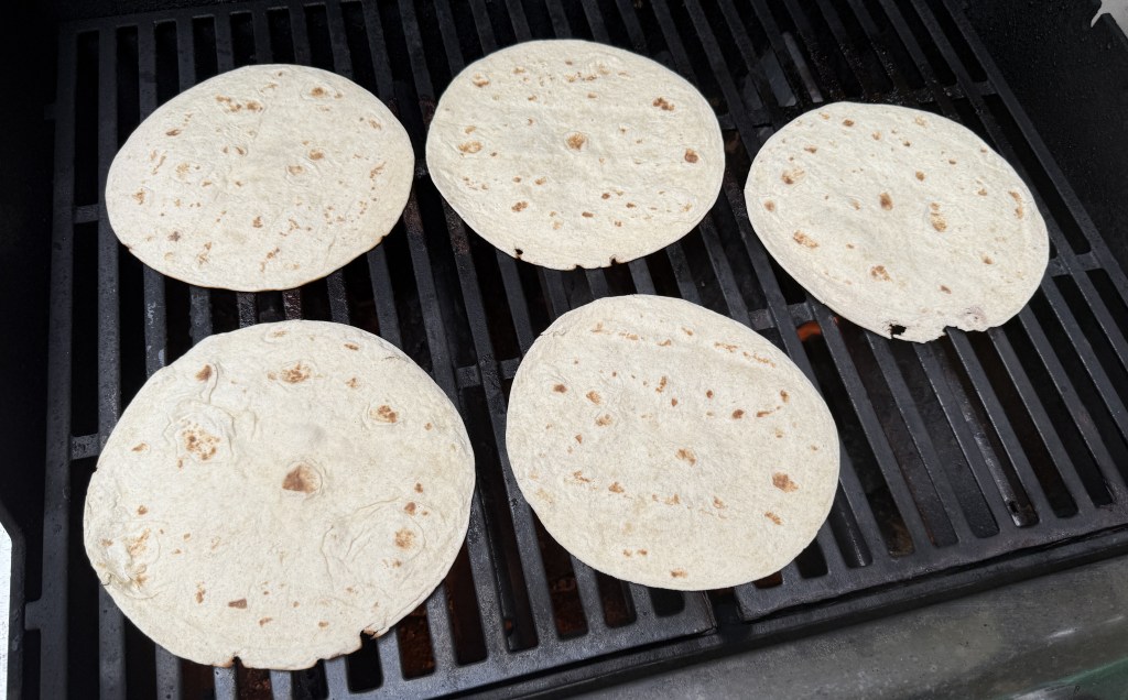 We bought a package of flour tortillas and quickly toasted both sides on the gas grill. The three pictures below show: the package of tortillas, a set of them just put on the grill, and then after they were flipped to toast on the second side. You can see a little color on the tortillas in that last picture.