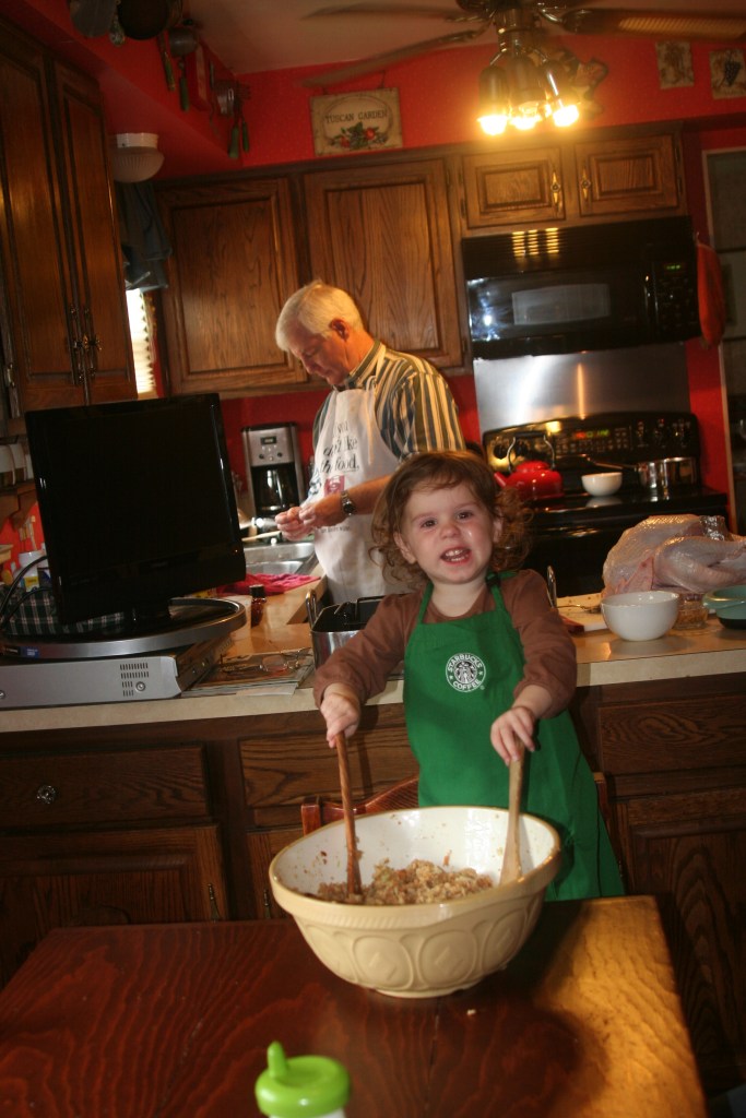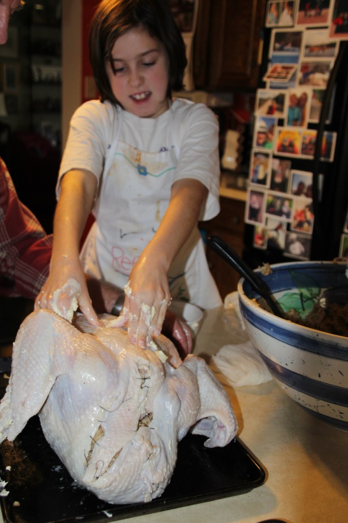 My roasting the Thanksgiving turkey has become a family tradition and each of my three children was my Sous Chef for a couple of years to learn my recipe and approach. Since she was 18 months old, my oldest granddaughter, Reese Davis, has been my Sous Chef and and this picture is Reese at 18 months old in 2007 helping to make the stuffing. She also tasted it frequently for quality control. Last year, when she was 15, she took on the lead role and I was her Sous Chef. This year Ray Davis, her youngest brother, age 8, has asked to join the team and learn how to roast a turkey. He really likes cooking at their house and I think he will quickly be a very productive member of the team. “I” and “we” are used somewhat interchangeably in these notes with we representing the team of Reese and I with assistance in some places from Beth.