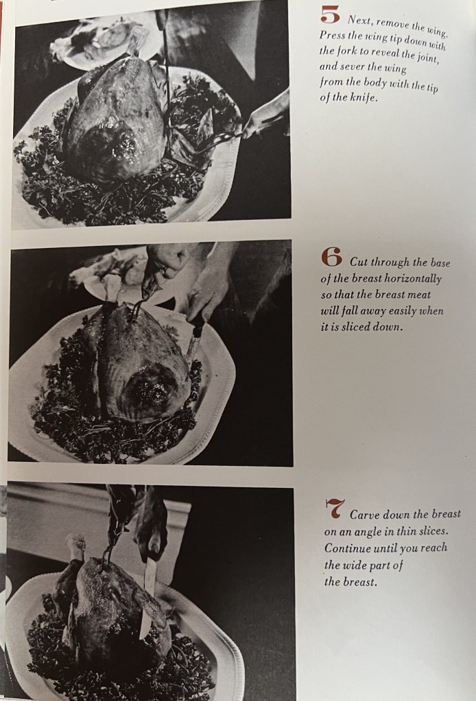 Roll the bird onto one side and cut down between the thigh and the body and push the leg away from the body so you can sever the leg from the body at the joint to remove the drumstick and thigh. Cut off the drumstick at the second joint and put on the serving platter. Slice off the dark meat from the thigh and add to the serving platter and cut as many slices of dark meat as you can from that side of the back of the turkey and add them to the platter. Roll the bird back upright and remove the wing by pressing the wing tip down and cutting the wing off from the body. The picture is a page from The Art of Carving, a very good book published by House and Garden that now sadly appears to be out of print. It shows you how to carve the breast effectively. The last picture about carving down at an angle is key to carve across the grain so the slices stay together. As you get the wide part of the breast, carve alternately from the back of the breast and the front of the breast, still at an angle to have medium size slices. When you have gotten as much meat as you can from that first side, determine If that gives you sufficient meat for the Thanksgiving meal. If so, you can stop there and take the other meat off the carcass after dinner or the next day. If you think you need more meat for the Thanksgiving meal, repeat the process for either the breast or the dark meat, or both. Slicing the 2nd breast later will keep it moister and take-home packages can be in larger pieces of breast that can be sliced the next day. Pieces of crispy skin that come off during the carving can go on one end of the serving platter.