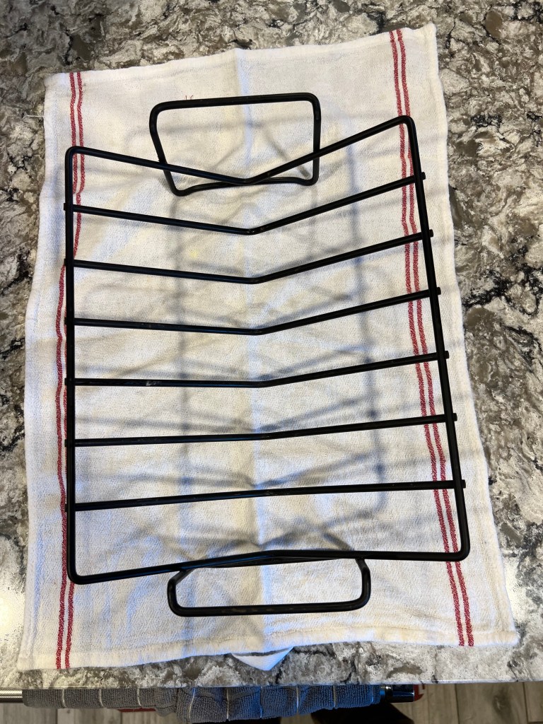 Roasting Rack – The roasting rack in the picture is used for any of the large birds that I cook, and I have also used it for some large beef roasts. I can turn it upside down and put it on my Kamado grill with slabs of pork ribs in each slot so I can cook about 3x what I could cook if I just lay them down on the grill. I take the roasting pan and this rack out on the deck and liberally spray them with Pam cooking spray. Doing it on the deck does not get the spray over other things in the kitchen. The rack is easy to clean without food caked to it.