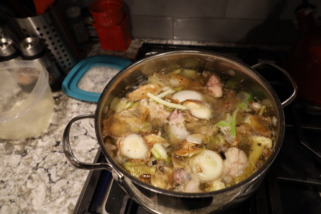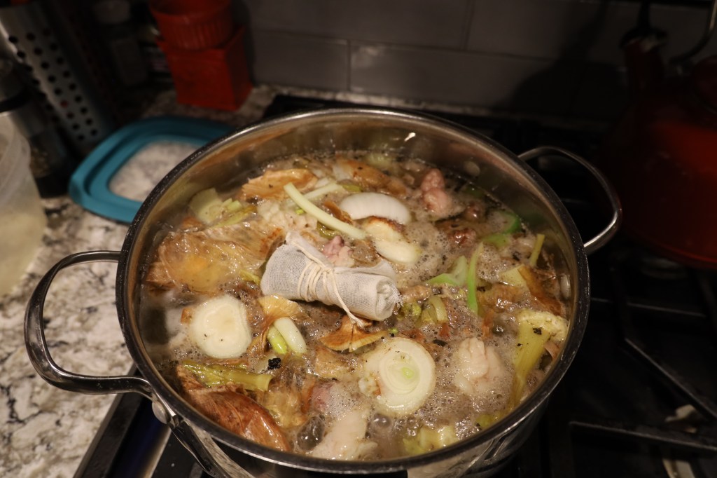 Good pots and pans are also very important, and I have done a couple of blog posts on cast iron and carbon steel fry pans. Our stock pot is the 5 quart Chantal stainless steel pan in the picture. It has nice weight and lets me start with about 4 quarts of water along with all the ingredients and, at the end, reduce that down to about 2 quarts of rich stock. We can also put this pan in the oven which we do when we make the turkey stock. I also use one of the ceramic baking dishes that I also use for lasagna for the dressing. I also use a basic sheet pan in part of the turkey prep.