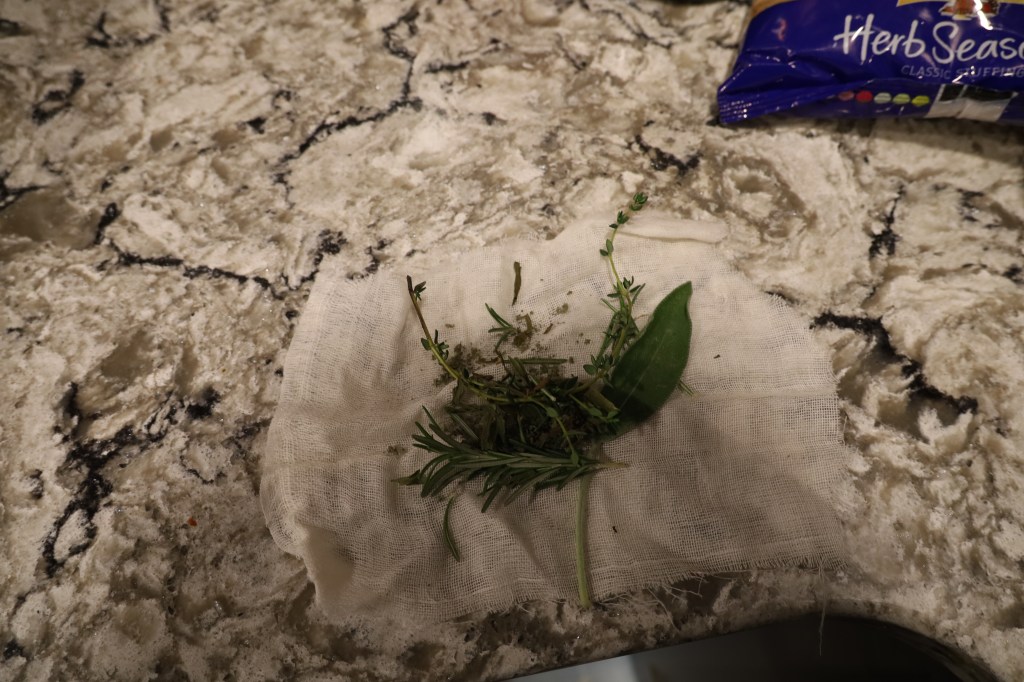 Cheesecloth – Covering the bird with cheesecloth that has been soaked in butter was the reason a total rookie like me hit a home run with my first turkey back in 1971. We have a family member with a dairy allergy so this year I am replacing all the ways in which butter is used in the attached recipe with olive oil. I made that comment several times in the recipe and I hope it is clear that you can make that substitution if needed. TV chef Michael Symon also likes using cheesecloth on his turkey but he soaks it in some different things, bourbon being one of them, and uses it a little differently than I do. I encourage you to check his cookbooks and streaming cooking shows about turkey for some other interesting things that you can do when you cover your roasting turkey with cheesecloth.