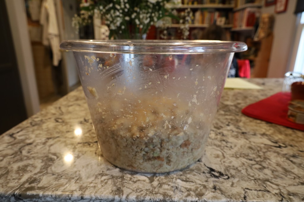 Very large bowl for stuffing – Two bags of Pepperidge Farm Stuffing along with the other ingredients takes up a lot of space. You want to move all those ingredients around to evenly mix them. I use this very large plastic tub for that I also put ice in this large tub to keep several bottles of white wine chilled for parties.