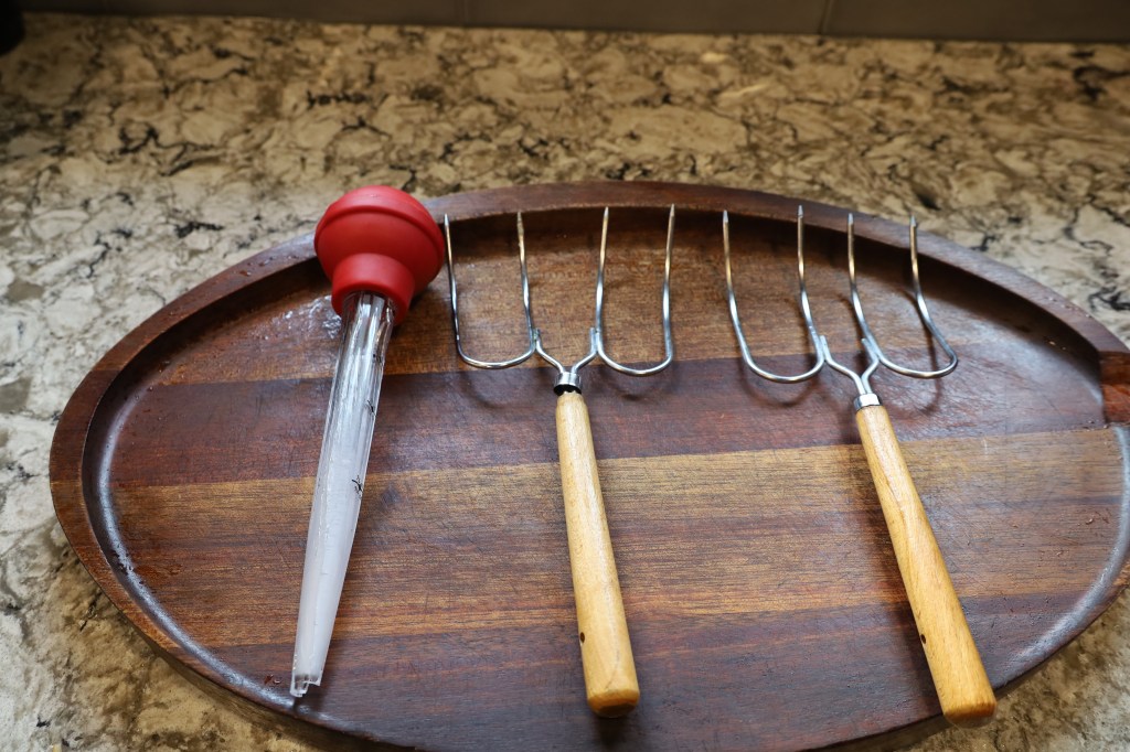Poultry forks – The real key to me rotating the partially cooked bird is these poultry forks. With someone holding the roasting pan and the rack. I can slide one fork in each end of the bird, lift it our of the pan, and rotate it 180 degrees to get the breast side up. Before I got these forks, I was using combinations or tongs and carving forks and the difficult process of rotating the bird earned the nickname “flipping the bird”. Now it is pretty simple, but part of that is having done it multiple times. I find the forks very good for getting any large bird out of a roasting pan and for some large pieces of hot meat like pork shoulder or brisket to get them off the grill to wrap in foil or butcher’s paper. I strongly encourage you to have good quality poultry forks as a kitchen tool. This is an Amazon link to ones for $19 that are very highly rated – https://www.amazon.com/KAYCROWN-Stainless-Lifters-Poultry-Carving/dp/B07B1Z7X9N/ref=sr_1_7?crid=3B63VQDCNYYXW&keywords=poultry+forks&qid=1668354806&sprefix=poultry+forks%2Caps%2C82&sr=8-7