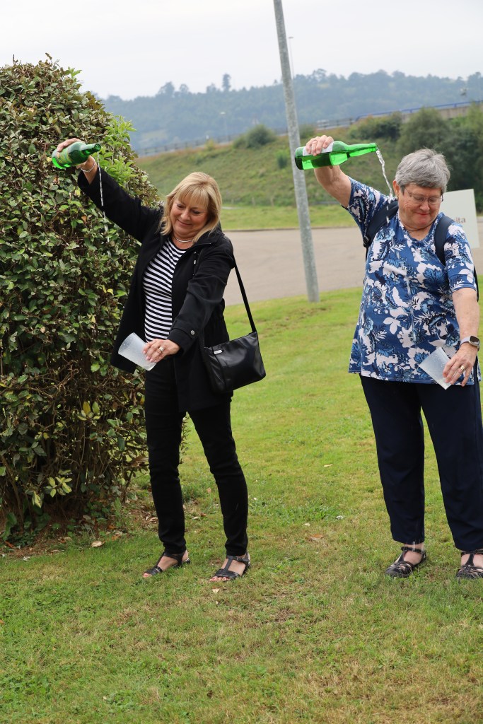 The Castanon Cidery was a lot of fun. They took us through the cider making process and one of their big things is that cider, at least their cider, needs to have a very long pour so the bubbles release and you get the full effervescence. They started out showing us how to properly pour their cider from the bottle into a glass but because there was a real learning curve here, only water was used. Six of our group volunteered, including Beth and Howard, where they had to hold the bottle over their heads and pour it into glasses held waist high without spilling it. You can see Beth and one of the other women have the bottle in the right position, but not all of it is ending up in the glass. After taking us through the cider making process, they offered tastes directly from one of the very large stainless-steel tanks. I am a big fan of English Hard Cider and I found this cider very light and fruity, so I was not a big fan. You can see the person from the cidery filling a glass for Beth with the glass held knee high and about a 4-foot stream shooting out of the tank into the glass. He did spill a few drops. We ended up in a room with big wooden barrels where we could pour our own glasses, again with a long stream shooting out of the barrel. I claimed IR status for the day with my stomach bug, so I did not try it. Beth did and they had a cylinder there that you could hold your glass over that would catch most of the stream that missed your glass. This became very important for Beth when she could not get the knob on the barrel to close and stop the stream and she had to yell for help. While I was not impressed with their cider, they did make it a fun and educational experience to learn about what they are doing.