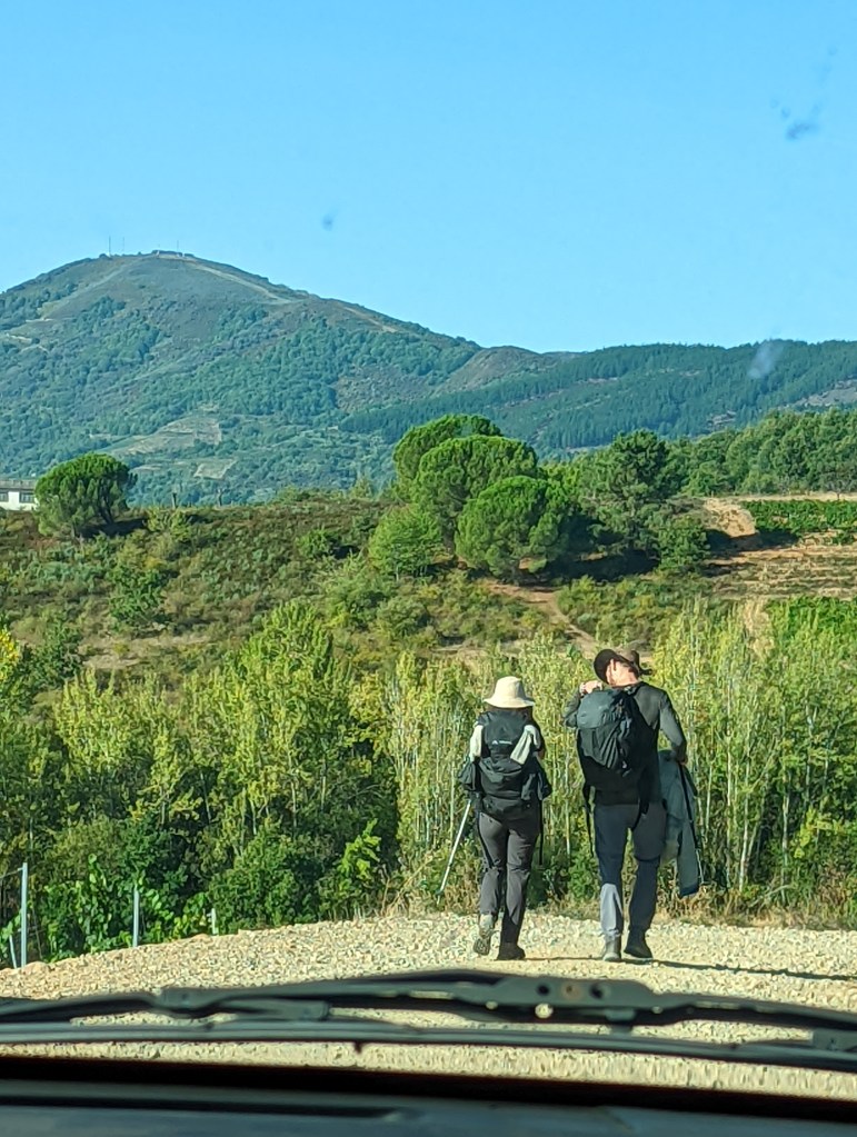When the bus stopped for us to visit the Casar du Burbia vineyard in Bierzo, we were a little surprised. We were on a small two lane road, that became a one lane road when our bus drove down it, and there were no winery buildings anywhere in sight. When we got off the bus we were led to the truck shown in the picture and told to climb up and hold onto the ropes. A couple of tour participants would have had great difficulty climbing up into the truck so there was a car following the truck that they could ride in. We then drove up into the hills on smaller and smaller roads until we stopped at a vineyard. Along the way we passed several hikers on their pilgrimage to Santiago de Compostela.