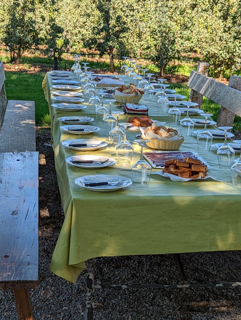 We tasted the Godella and the Mencia grapes from a number of vines and then got back in the truck which took us back to the bus and that drove us to the Burbia winery. It was about 11 AM when we got there and they first took us through the winery which was in production and showed us how they punched down their red wines by hand to keep the skins in contact with the juice to pull all the flavors out. We laughed at seeing the John Deere tractors but they were the standard at every vineyard where we saw their tractors. Our hots had set out a lovely long table in the shade with a wonderful spread of charcuterie, bread, and cheeses as shown in the picture. We know that we were going a restaurant specializing in great steaks for lunch in a couple of hours, but the spread was so good we ate too much along with the delicious wines we tasted.