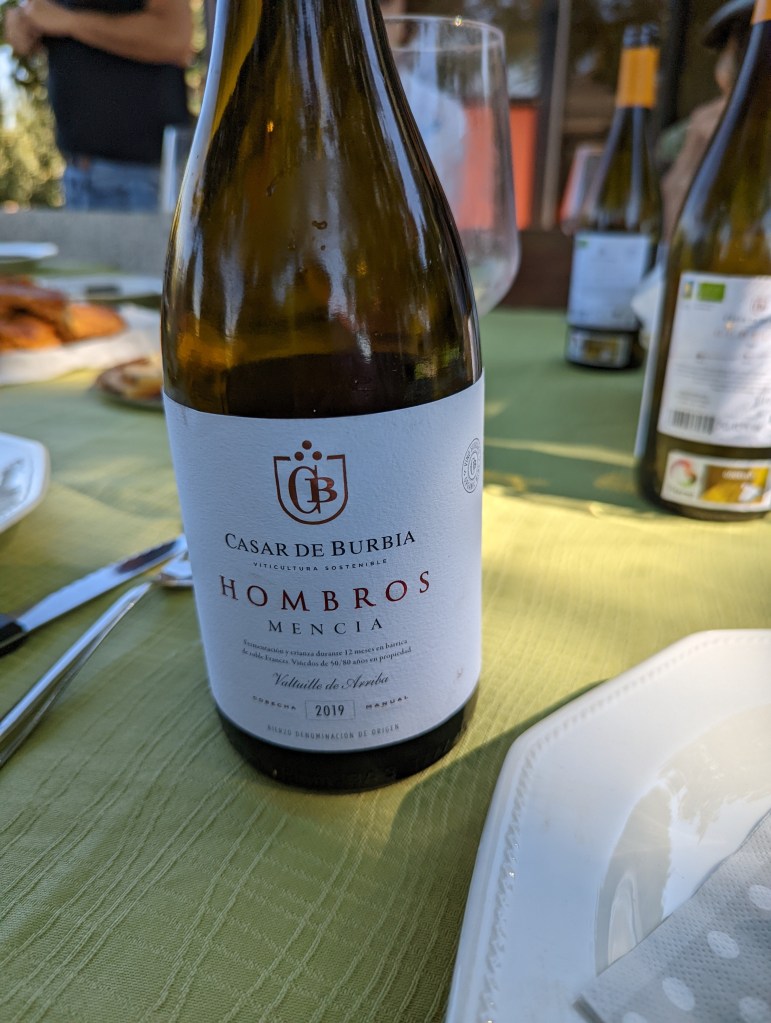 The first two wines that they took us through were Godella. Their standard 2020 Godella has a retail price in the US of $15 and we loved it. They also do an oaked 2019 Godella that has Barrica on the label. It has a retail price of $22. Some of the people really preferred that wine but I liked the unoaked better and have purchased some for my cellar. We were then introduced to their wines made from the red Mencia grape and Beth and I quickly fell in love with it. Mencia is to Tempranillo, the red wine Spain is famous for, as Cab Franc is to Cabernet Sauvignon, softer and rounder with less tannin but great flavor. Their basic Mancia has a retail price of $15 with cherry, blueberry, and floral aromas with polished tannins and long bright mineral finish. I apologize that I did not capture a picture of that bottle. Then we had the 2019 Hombros Mencia which has a retail price of $20. This was aged longer than the introductory Mencia and is very worth that price but unfortunately seems to be harder to find in the US than their other wines. We finished up with the 2016 Tebiada Mencia which has a retail price of $25. It had several years of aging and was juicy with a medium long finish. The dry, medium body had black cherry, violet, blackberry, blueberry, plum, oak and granite flavors and aromas. It was my favorite wine of the day. The pictures of these four wines may help you find them. I highly recommend all of them.