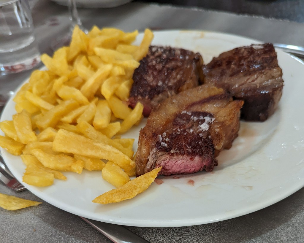 We then took a short bus ride to the town of Ponferrada and had lunch at the Venecia Restaurant which was included in our tour price. Their specialty is steaks from all over the world and we had a lovely grass-fed steak from Argentina with fries as shown in the picture. Spanish food is delicious but having a change of pace to a premium steak and fries was very enjoyable. Lunch was accompanied with another Mencia wine which is shown in the picture. It was a 2021 so no aging but very nice with the steak. I do not know if this wine is available in the US. Lunch started about 3 PM which is typical in Spain.