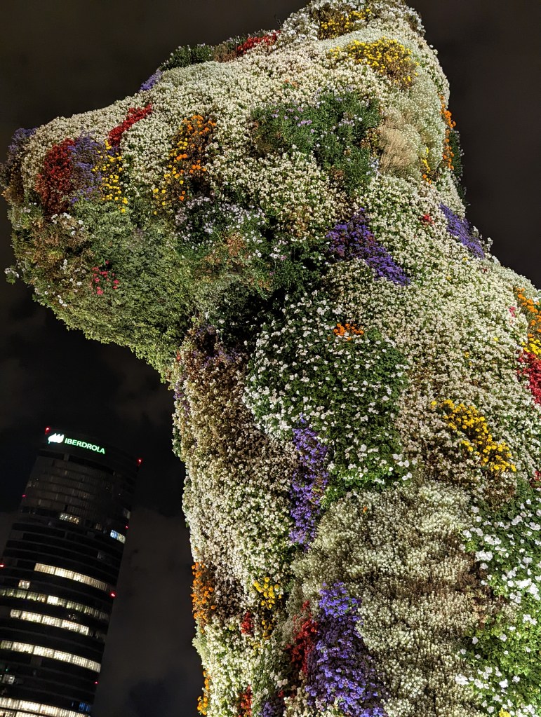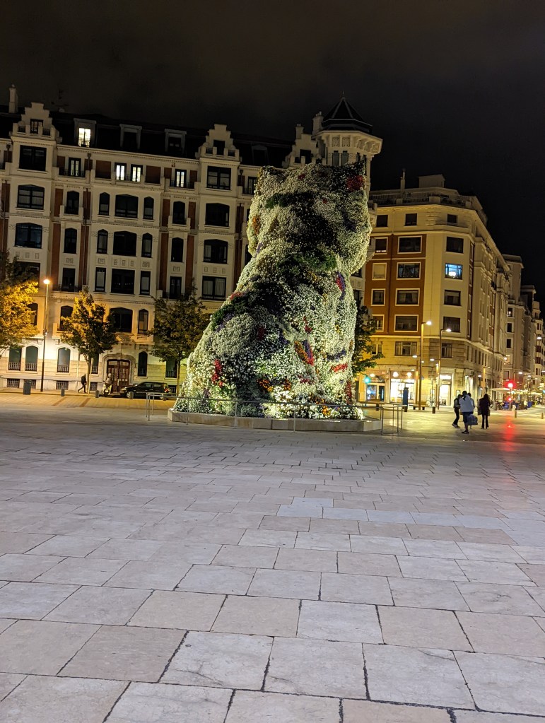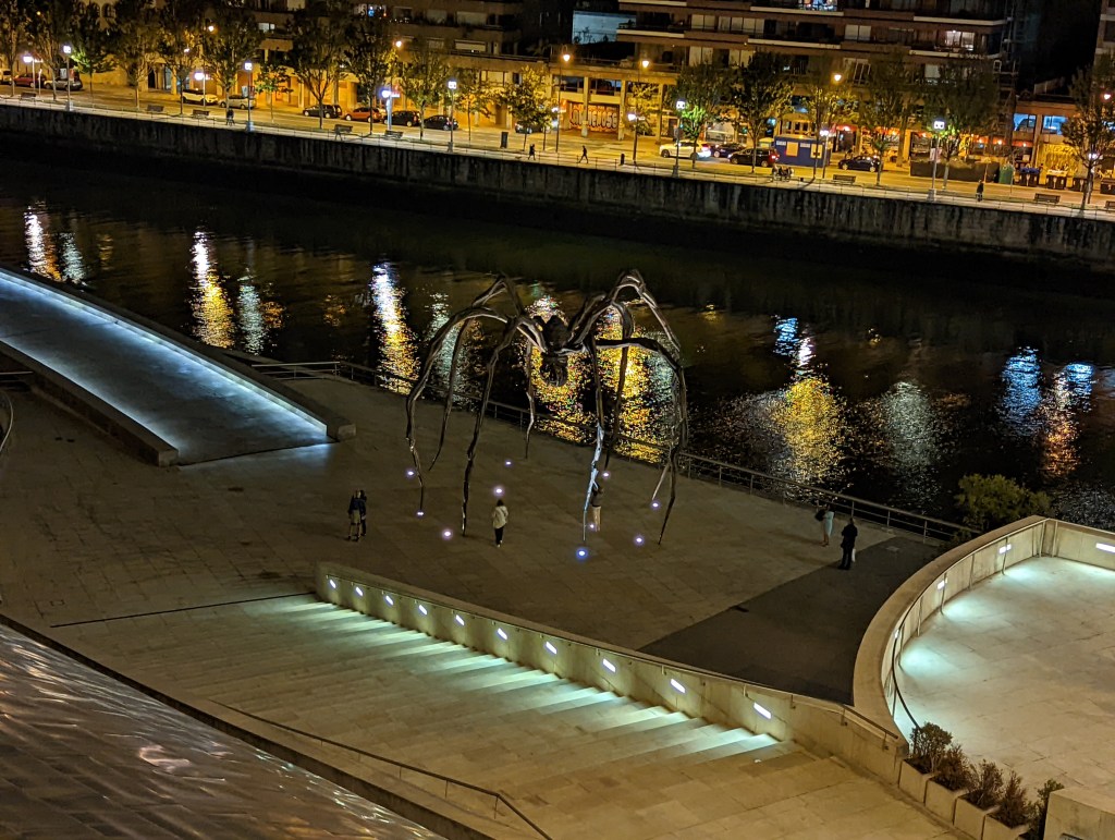 On Saturday we spent the full day in Bilbao, no bus rides 😊! We had a lovely breakfast on their roof top overlooking the Museum and the river. Excellent food and fantastic service. We then had a guided tour of the Guggenheim Museum. After the tour we walked around to the river side of the Museum to Nerua, a Michelin 1 Star restaurant that is in the Museum building but not directly accessible from the Museum. We had a fantastic 10 course tasting menu there with five lovely Spanish wines. After this long, delightful lunch we walked around the outside of the museum taking more pictures, this time in daylight.