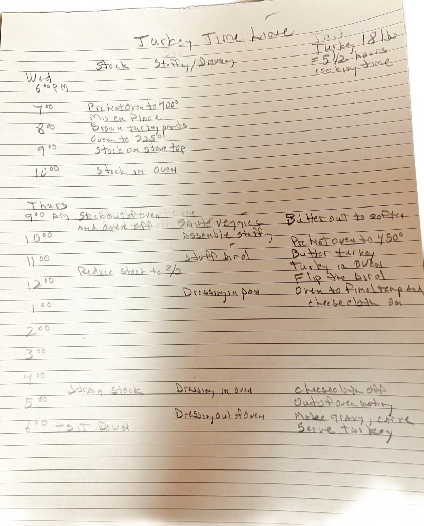 Creating a Timeline for the turkey – The first thing that Reese and I do when she comes over on the Wednesday before Thanksgiving is to create a timeline of everything we need to do and when that needs to happen. The picture shows a sample of that timeline where at the bottom of the page we put the time when Beth wants everyone to sit down at the table. We then put half hour increments up the page for the things that must happen on Thursday and above that half hour increments for what we need to do Wednesday evening (or afternoon if we want). One of the key things this timeline does is identify when key resources like the oven and different burners on the range are being used. Our three children are now married and in their own homes, two of them with children. They now bring the side dishes and dessert each year and they can add any kitchen resources that they need to the timeline so everyone has what they need. One of the key things is knowing what time any oven needs to be preheated so it is at the right temperature when needed. How much time is needed on Thursday to make the stuffing, stuff the bird, sew it up, and cover it with butter or olive oil is a driving factor. Once that process is finished the bird should go right into the oven. It should not sit on the counter for more than 30 minutes after it has been stuffed. If we finish the stuffing process very early, the bird will be out of the oven, rested and ready for carving well before Beth wanted everyone to sit down and the side dishes may not be ready yet. Even worse, if that process takes longer, the bird will not be ready at the scheduled start time. When the turkey goes in the oven, Reese and I quickly review the timeline to see if we need to make any adjustments for next year in that process so we have history to help us budget that time correctly. Some of the things that should be in your timeline include: